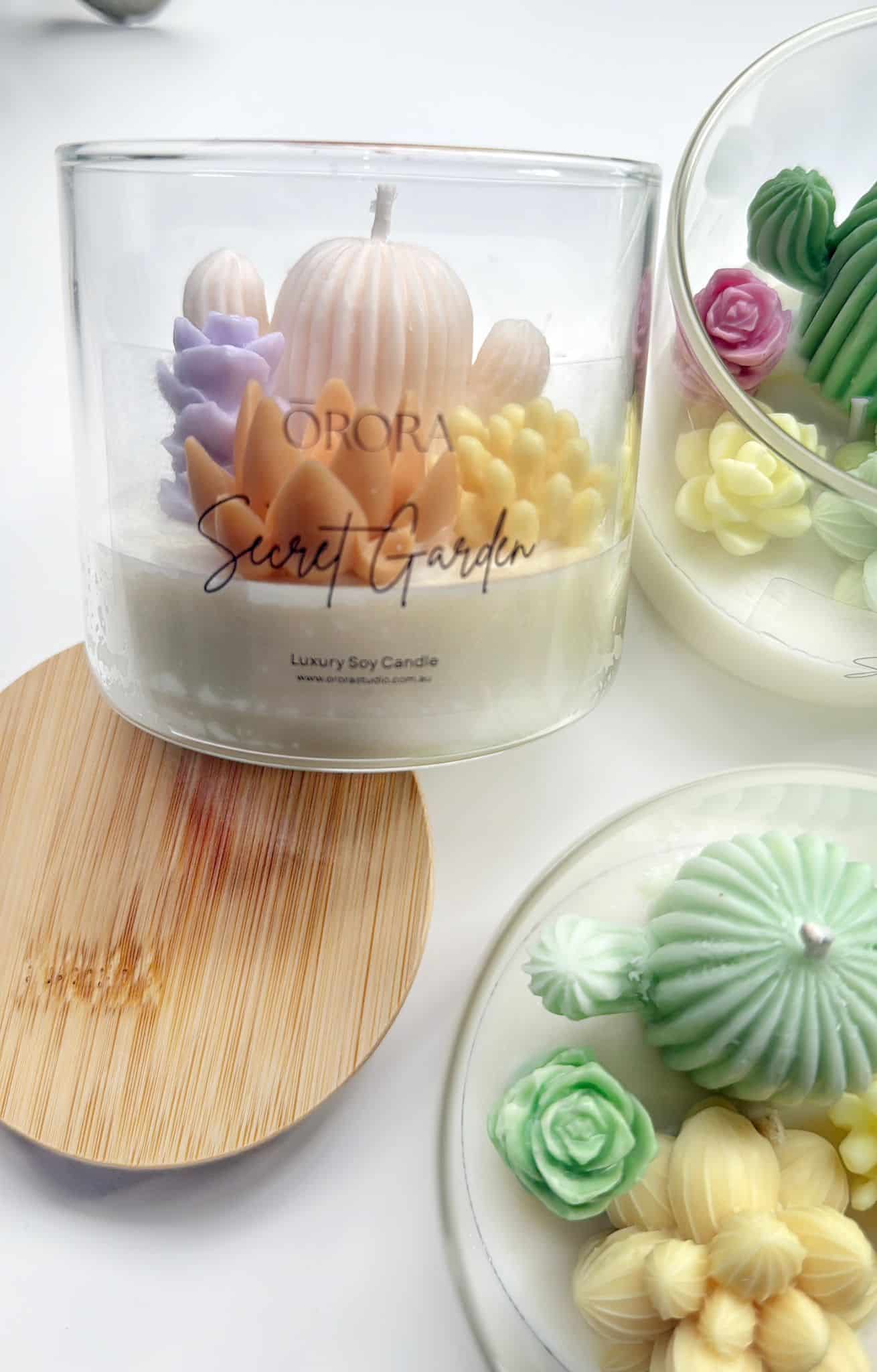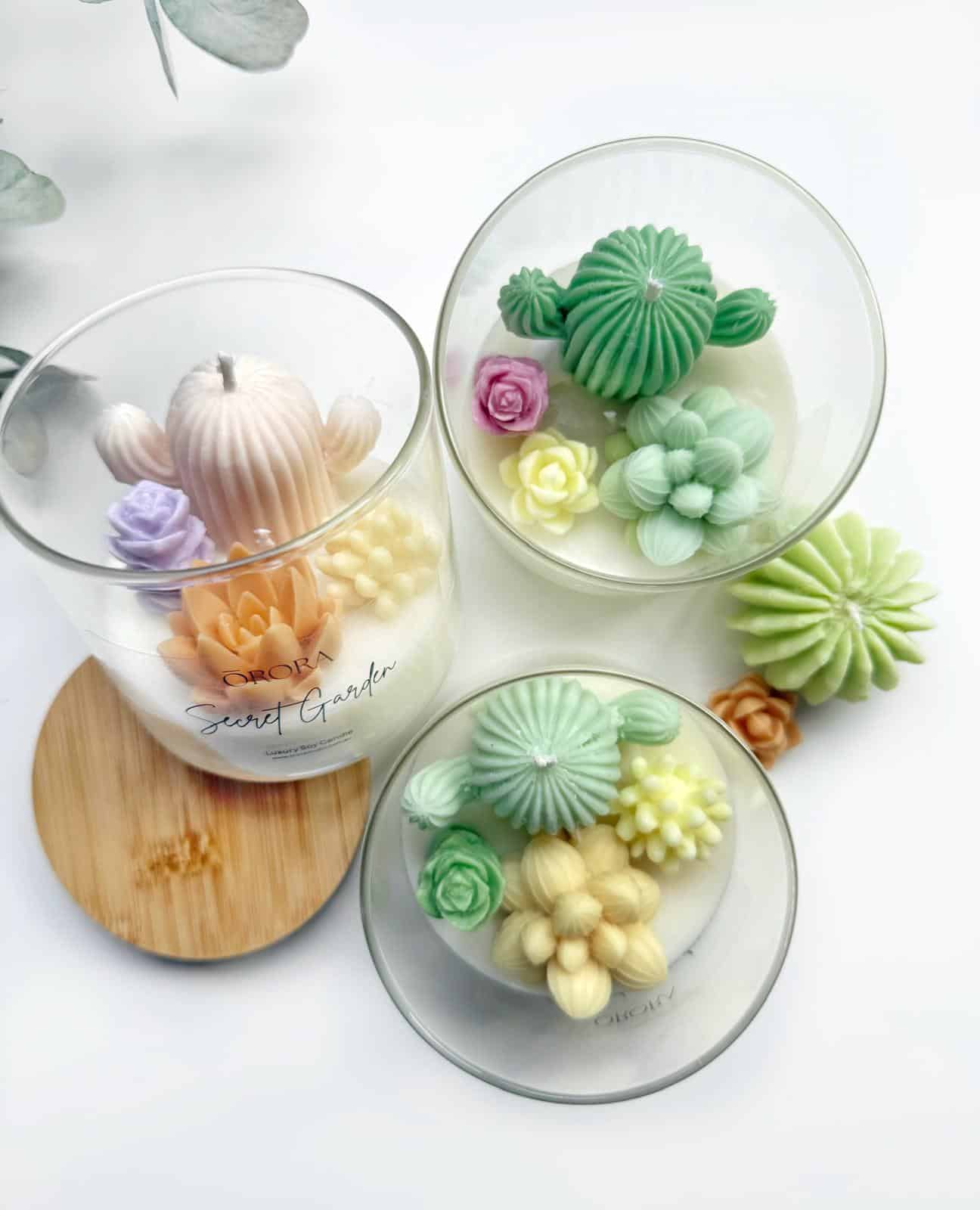 A beautifully hand-poured candle featuring delicate pastel wax succulents and flowers arranged in a clear glass jar. Clean-burning, decorative, and perfect for gifting, it brings a soft, serene touch to any space.